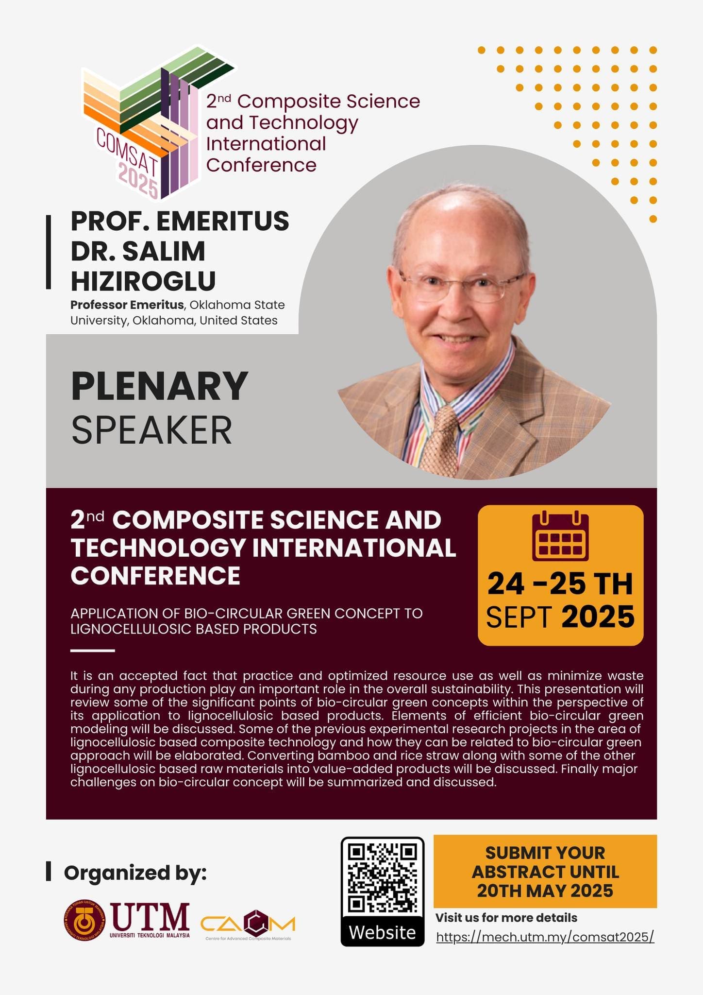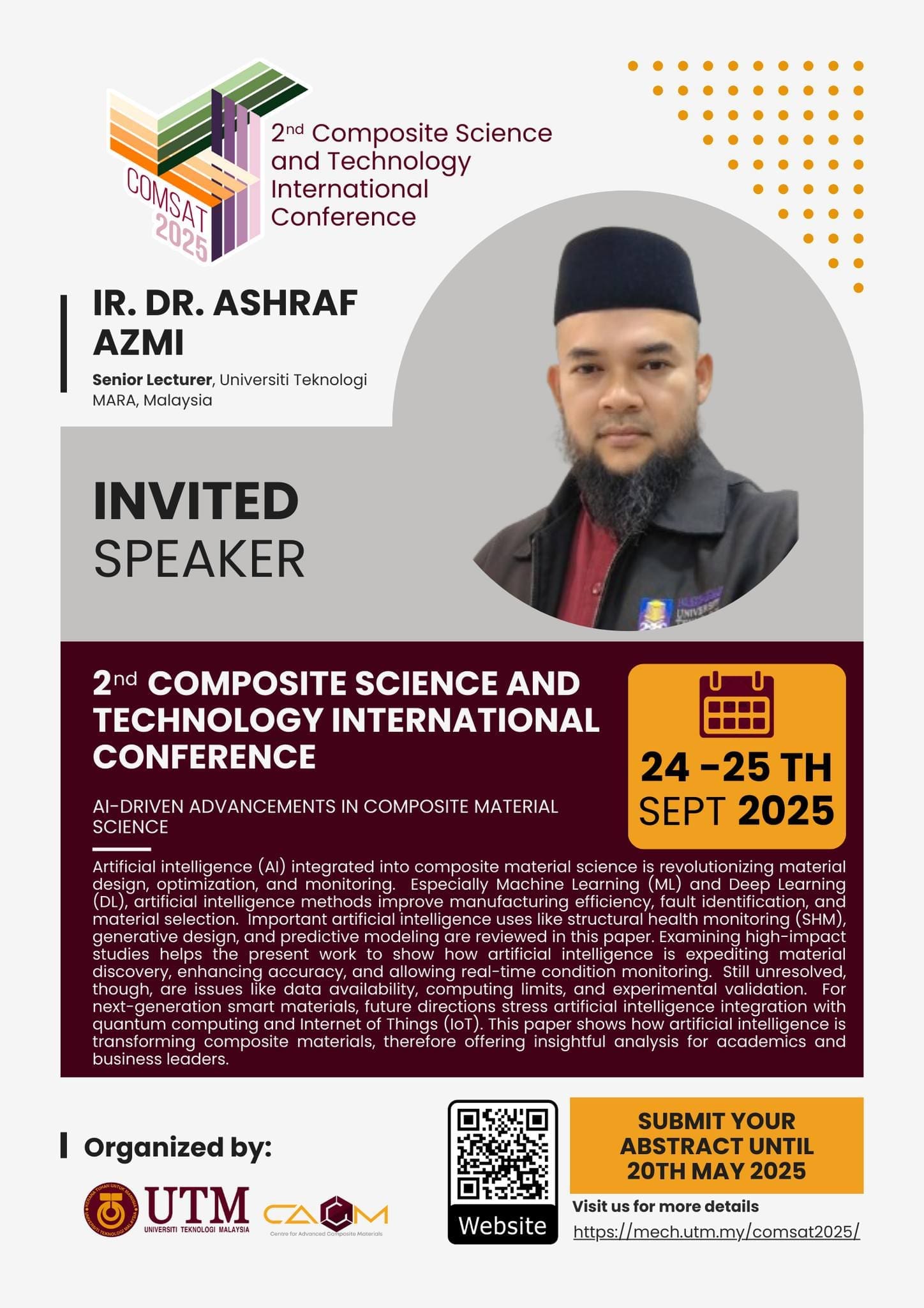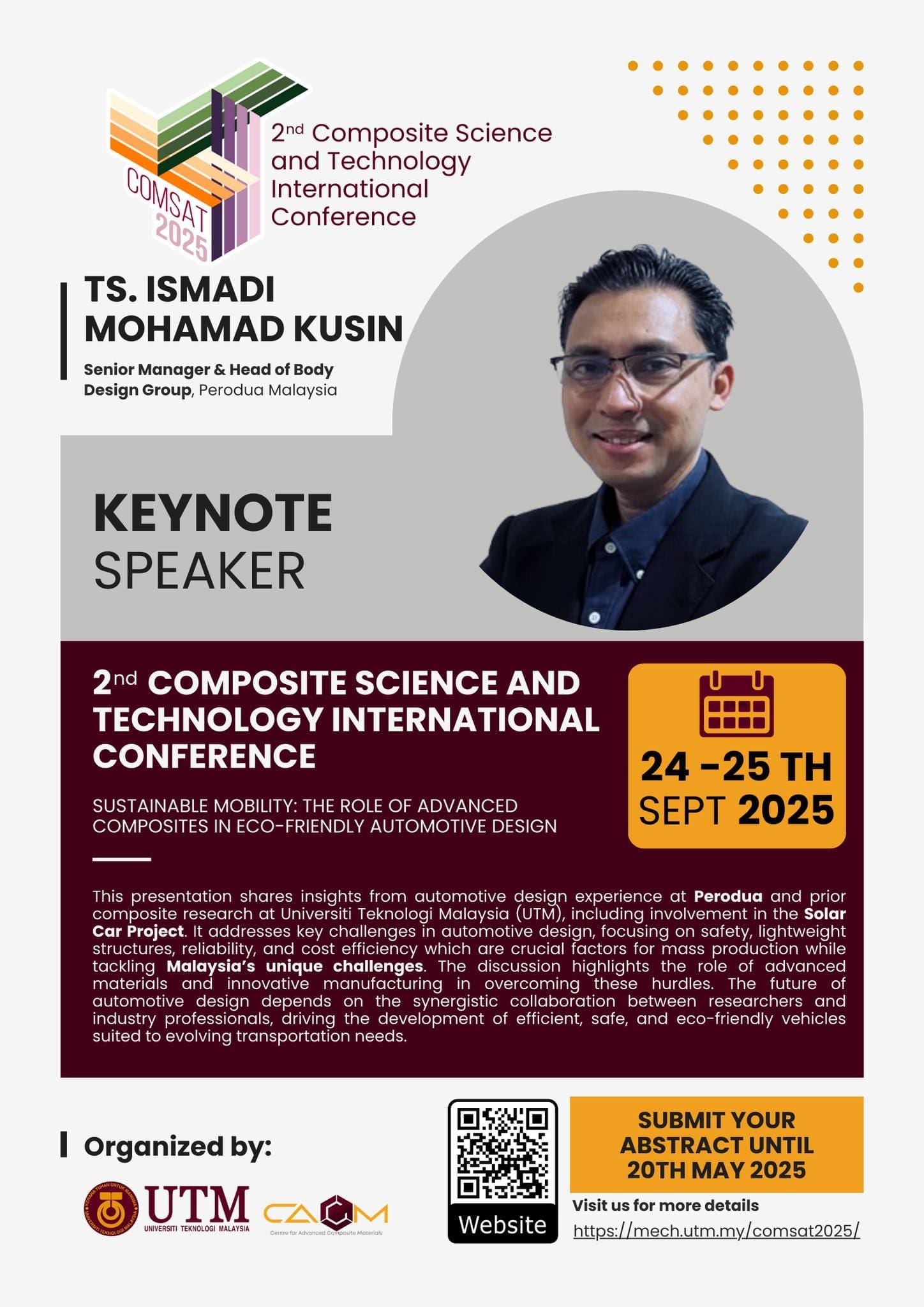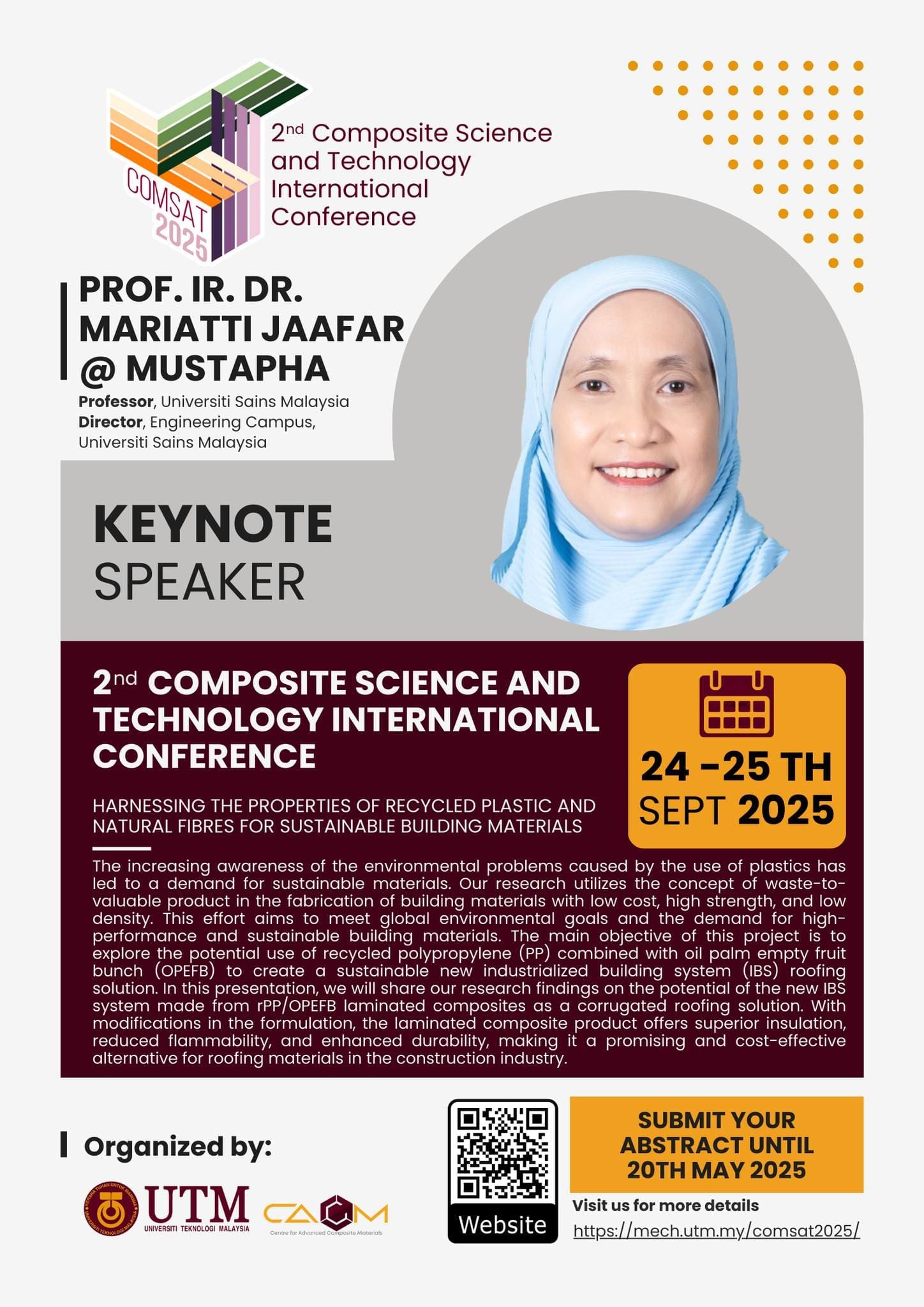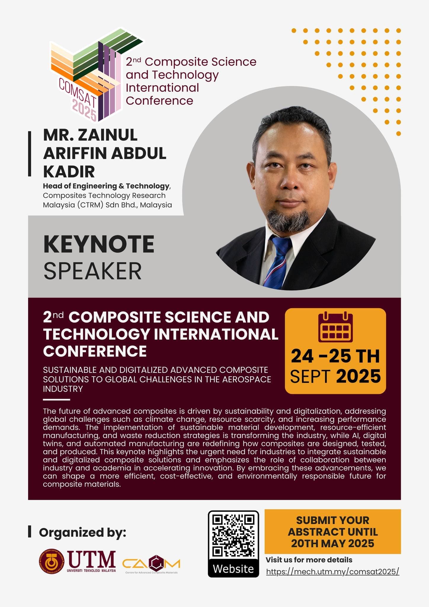 2nd Composite Sciences and Technology International Conference (COMSAT) 2025 is a prestigious tri-annual conference that gathers leading researchers, academics, and industry experts worldwide to exchange the latest advancements in composite materials. The conference covers various topics, including manufacturing, testing, characterization, and applications of composite materials. Following the success of the inaugural COMSAT2022, this edition will also be conducted entirely online, ensuring accessibility for participants across different regions. The main theme of COMSAT2025 is “Sustainable and Digitalized Advanced Composite Solutions to Global Challenges.” This theme underscores the pivotal role of composite materials in addressing contemporary global issues, particularly in sustainability and digital transformation. COMSAT 2025 is organized by the Centre for Advanced Composite Materials (CACM), Universiti Teknologi Malaysia (UTM), in collaboration with over 20 universities and research institutes from around the world.