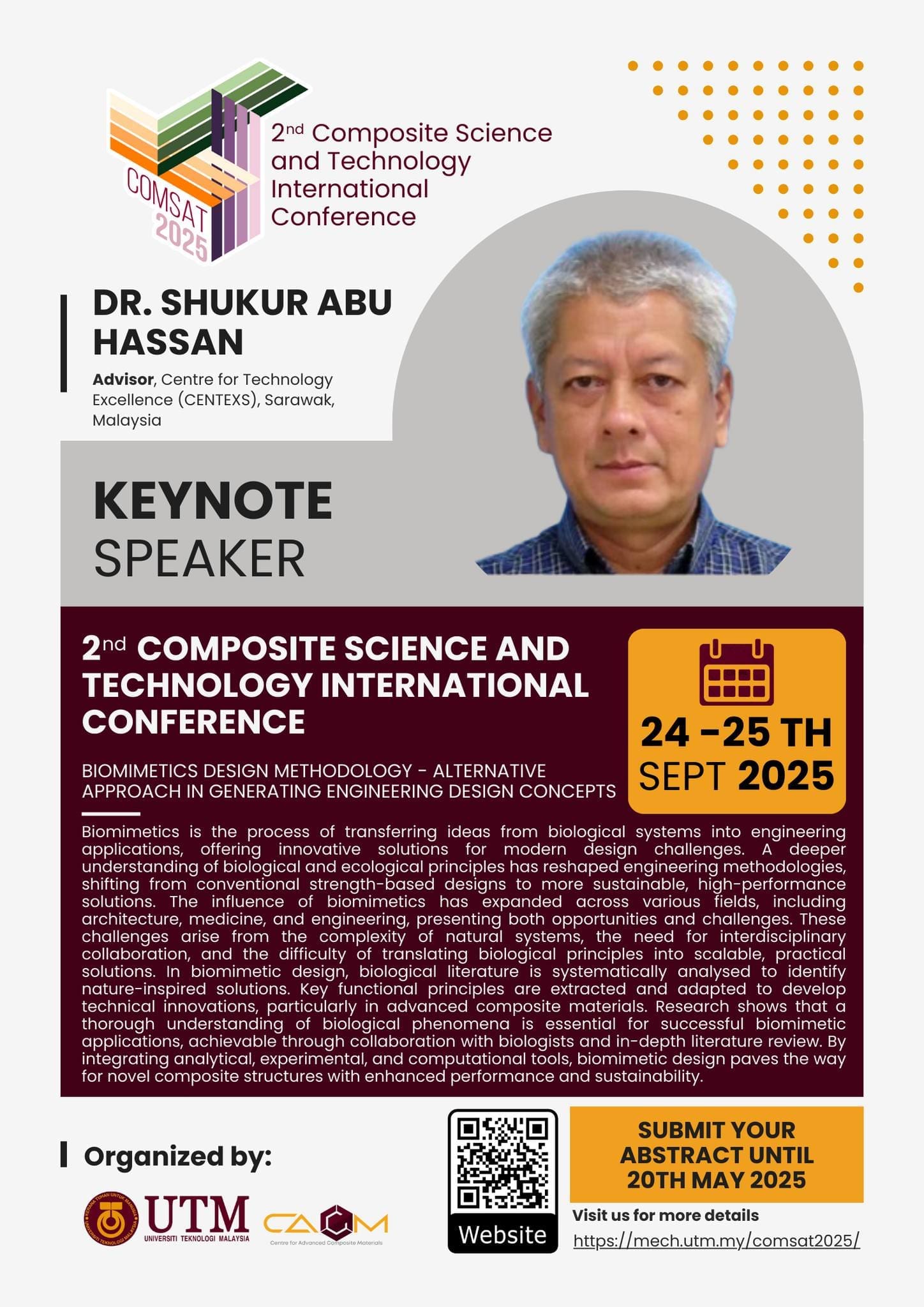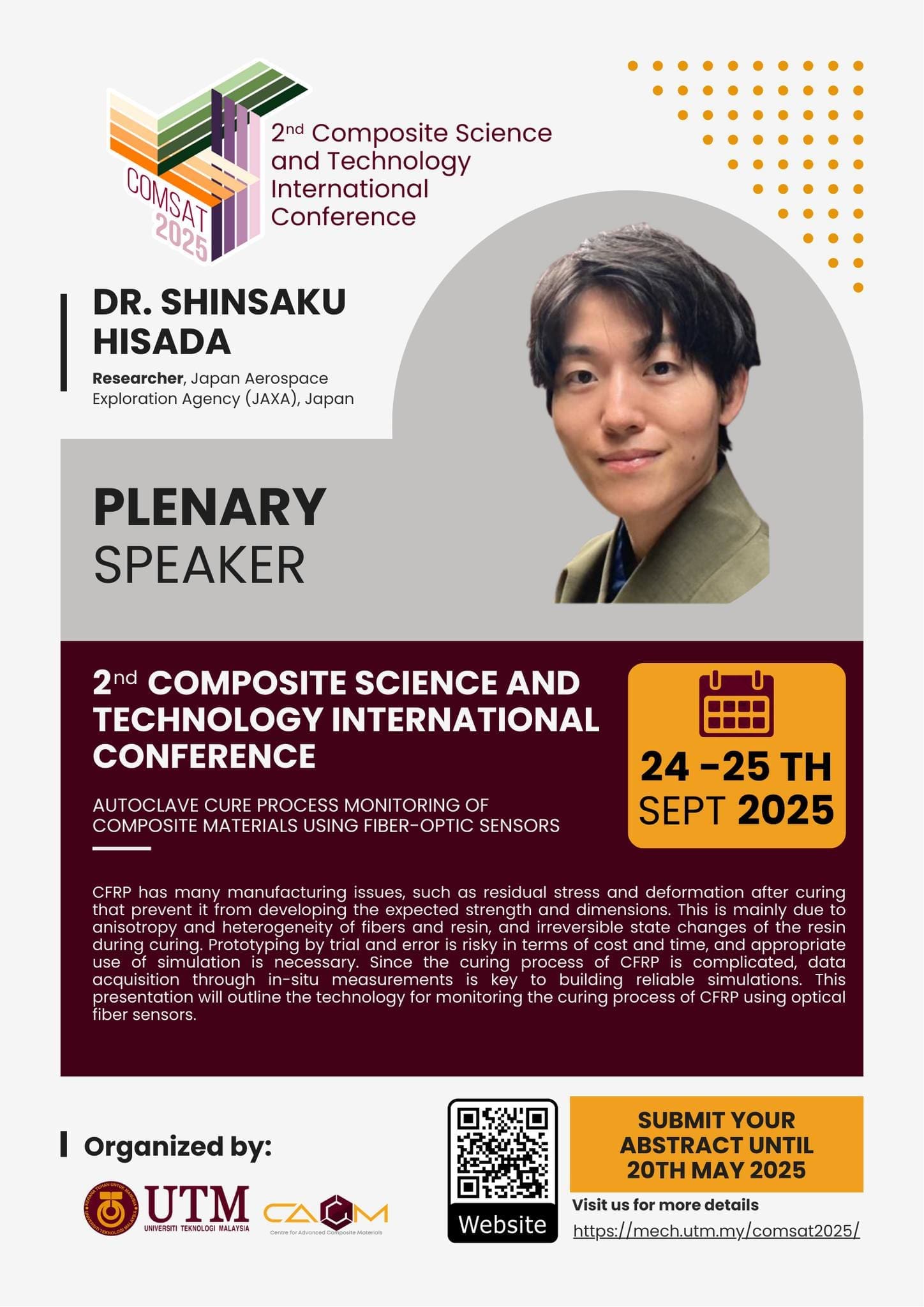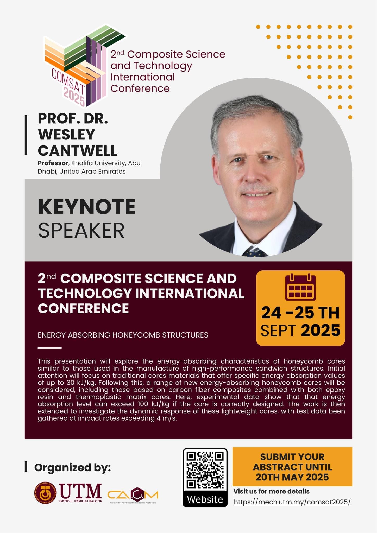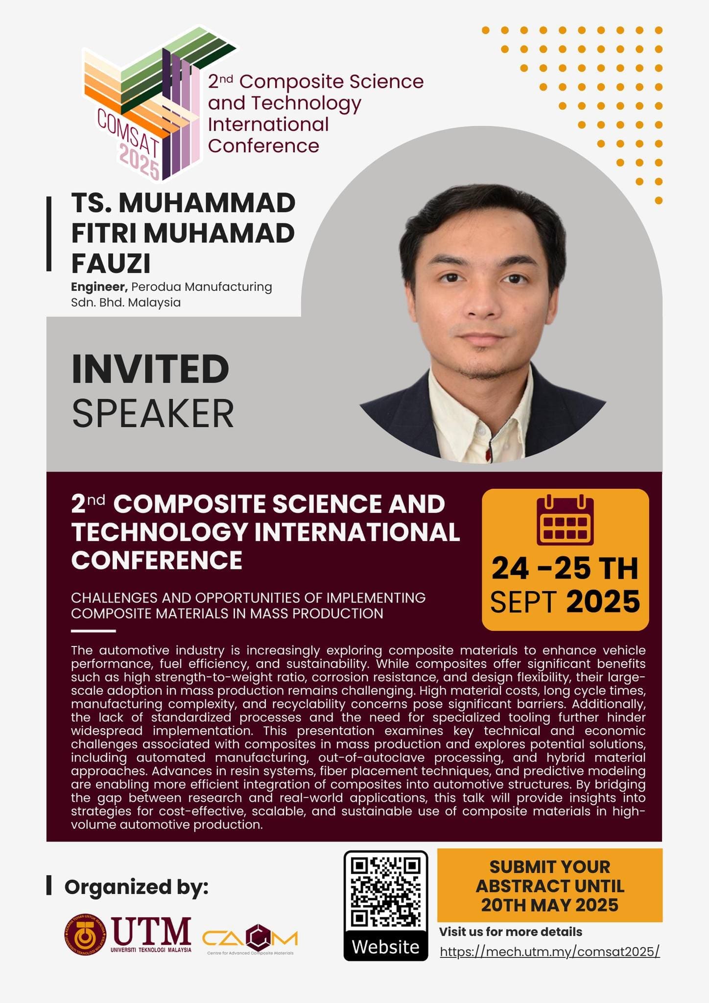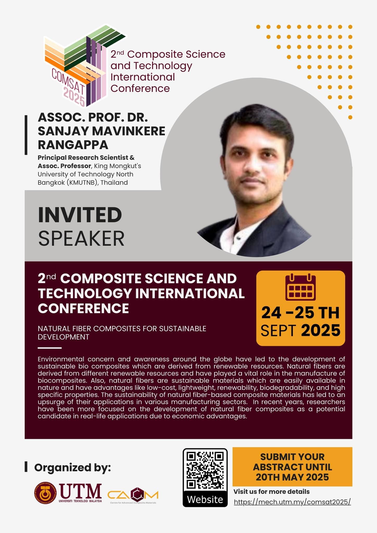 2nd Composite Sciences and Technology International Conference (COMSAT) 2025 is a prestigious tri-annual conference that gathers leading researchers, academics, and industry experts worldwide to exchange the latest advancements in composite materials. The conference covers various topics, including manufacturing, testing, characterization, and applications of composite materials. Following the success of the inaugural COMSAT2022, this edition will also be conducted entirely online, ensuring accessibility for participants across different regions. The main theme of COMSAT2025 is “Sustainable and Digitalized Advanced Composite Solutions to Global Challenges.” This theme underscores the pivotal role of composite materials in addressing contemporary global issues, particularly in sustainability and digital transformation. COMSAT 2025 is organized by the Centre for Advanced Composite Materials (CACM), Universiti Teknologi Malaysia (UTM), in collaboration with over 20 universities and research institutes from around the world.