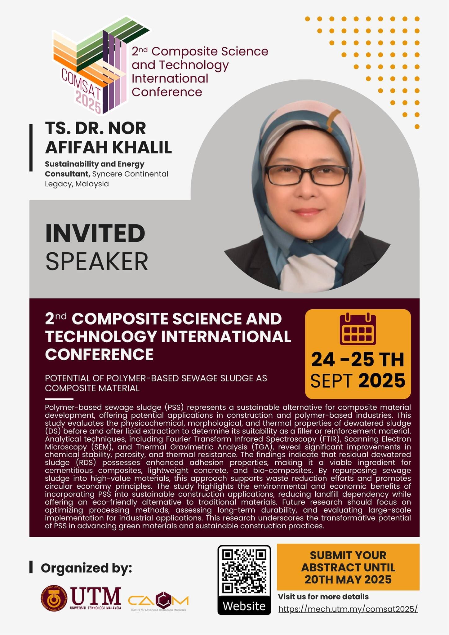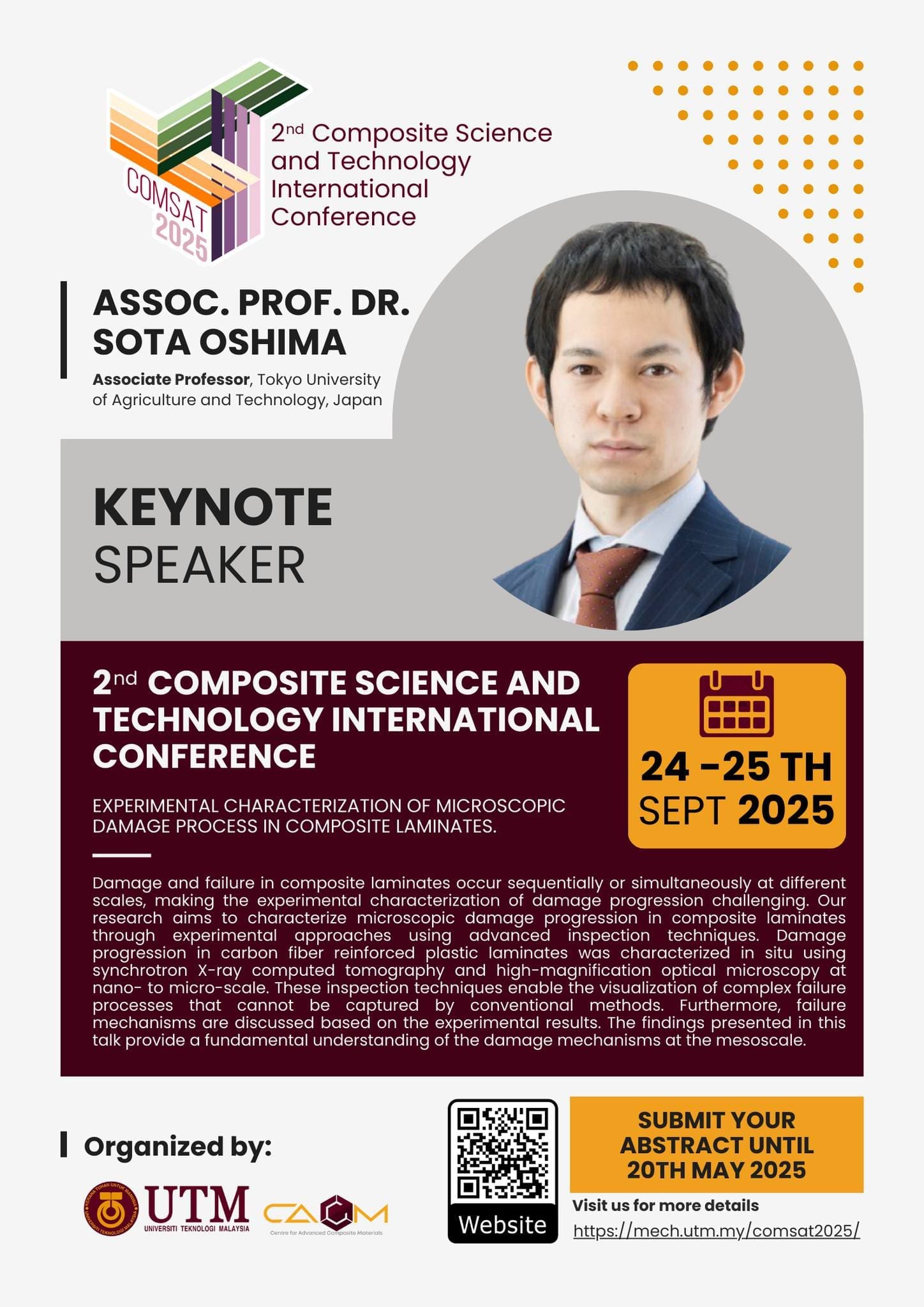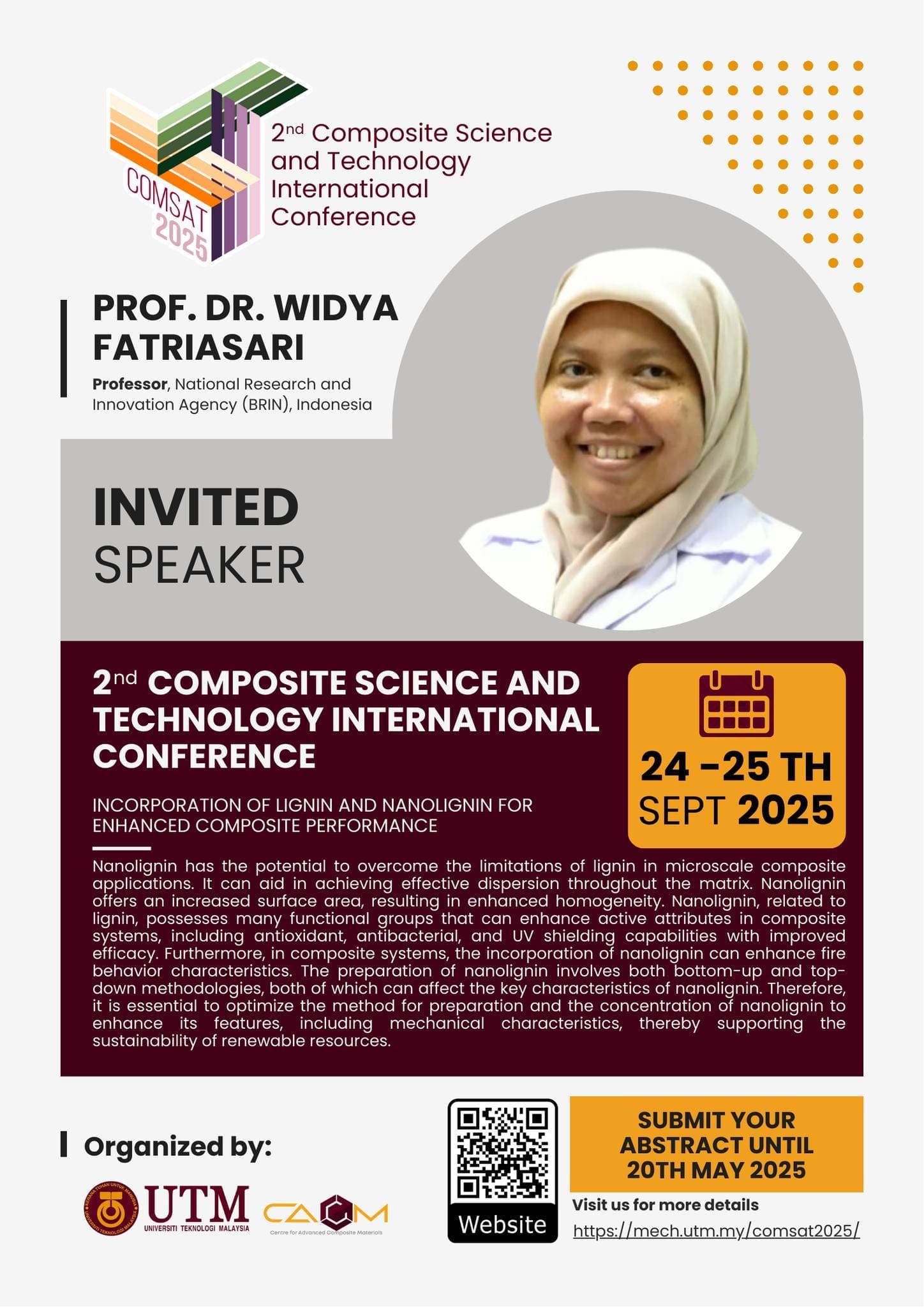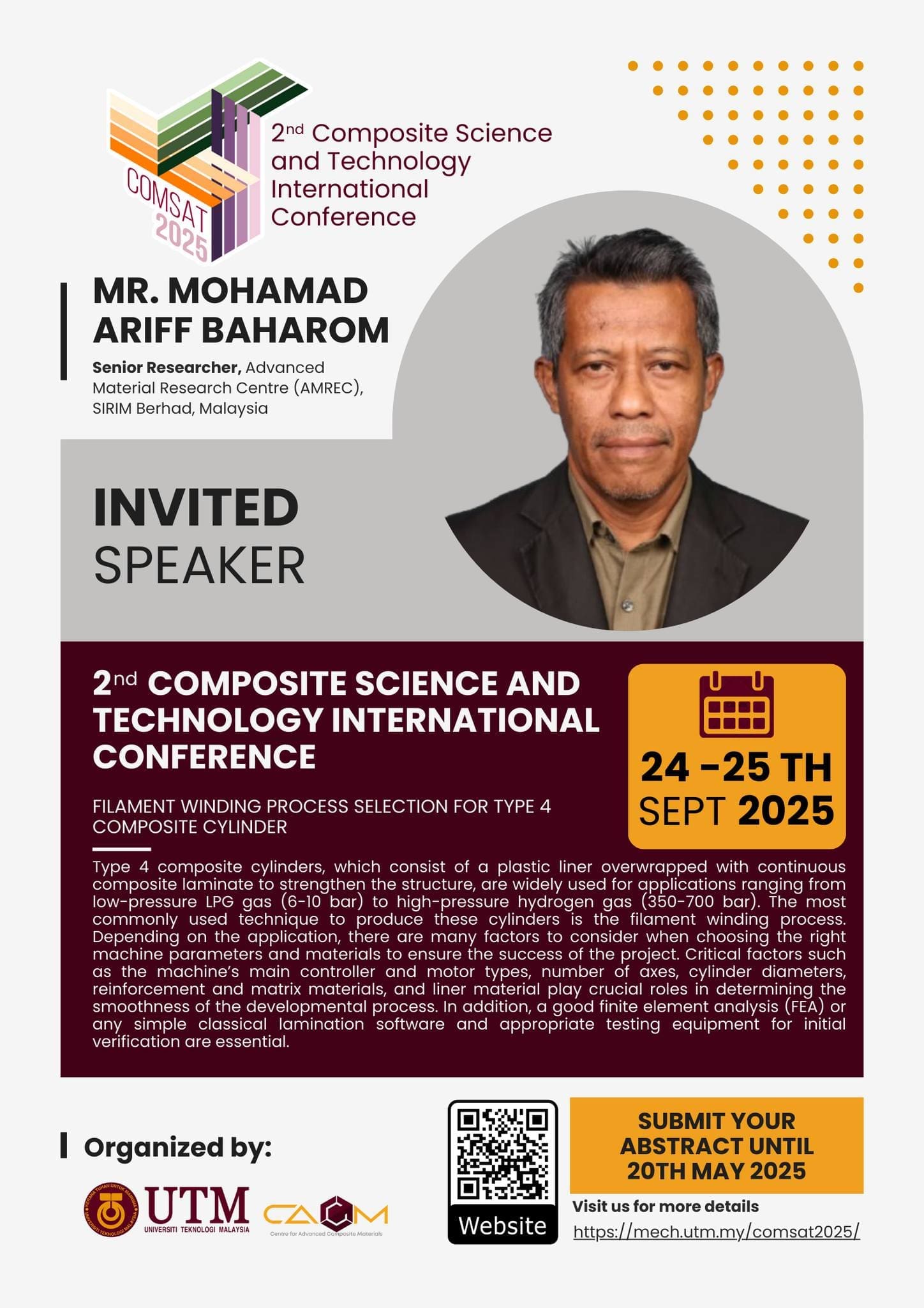 2nd Composite Sciences and Technology International Conference (COMSAT) 2025 is a prestigious tri-annual conference that gathers leading researchers, academics, and industry experts worldwide to exchange the latest advancements in composite materials. The conference covers various topics, including manufacturing, testing, characterization, and applications of composite materials. Following the success of the inaugural COMSAT2022, this edition will also be conducted entirely online, ensuring accessibility for participants across different regions. The main theme of COMSAT2025 is “Sustainable and Digitalized Advanced Composite Solutions to Global Challenges.” This theme underscores the pivotal role of composite materials in addressing contemporary global issues, particularly in sustainability and digital transformation. COMSAT 2025 is organized by the Centre for Advanced Composite Materials (CACM), Universiti Teknologi Malaysia (UTM), in collaboration with over 20 universities and research institutes from around the world.