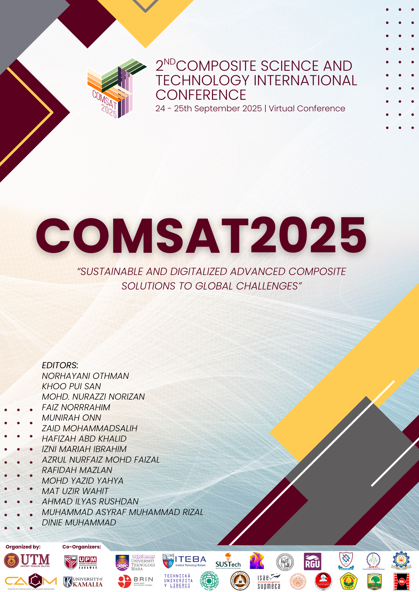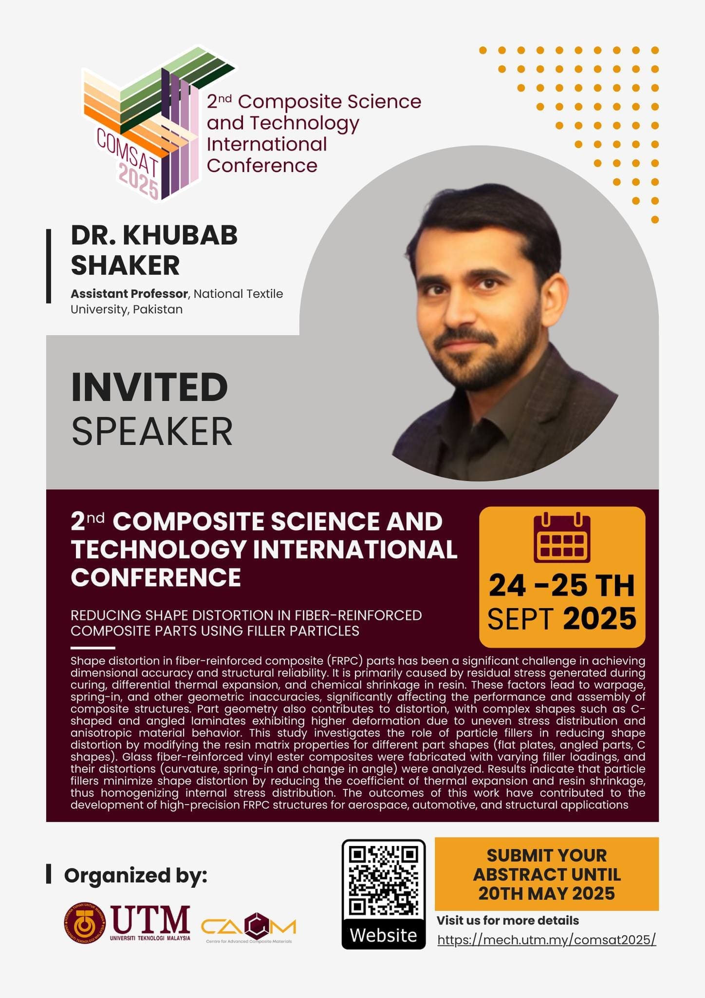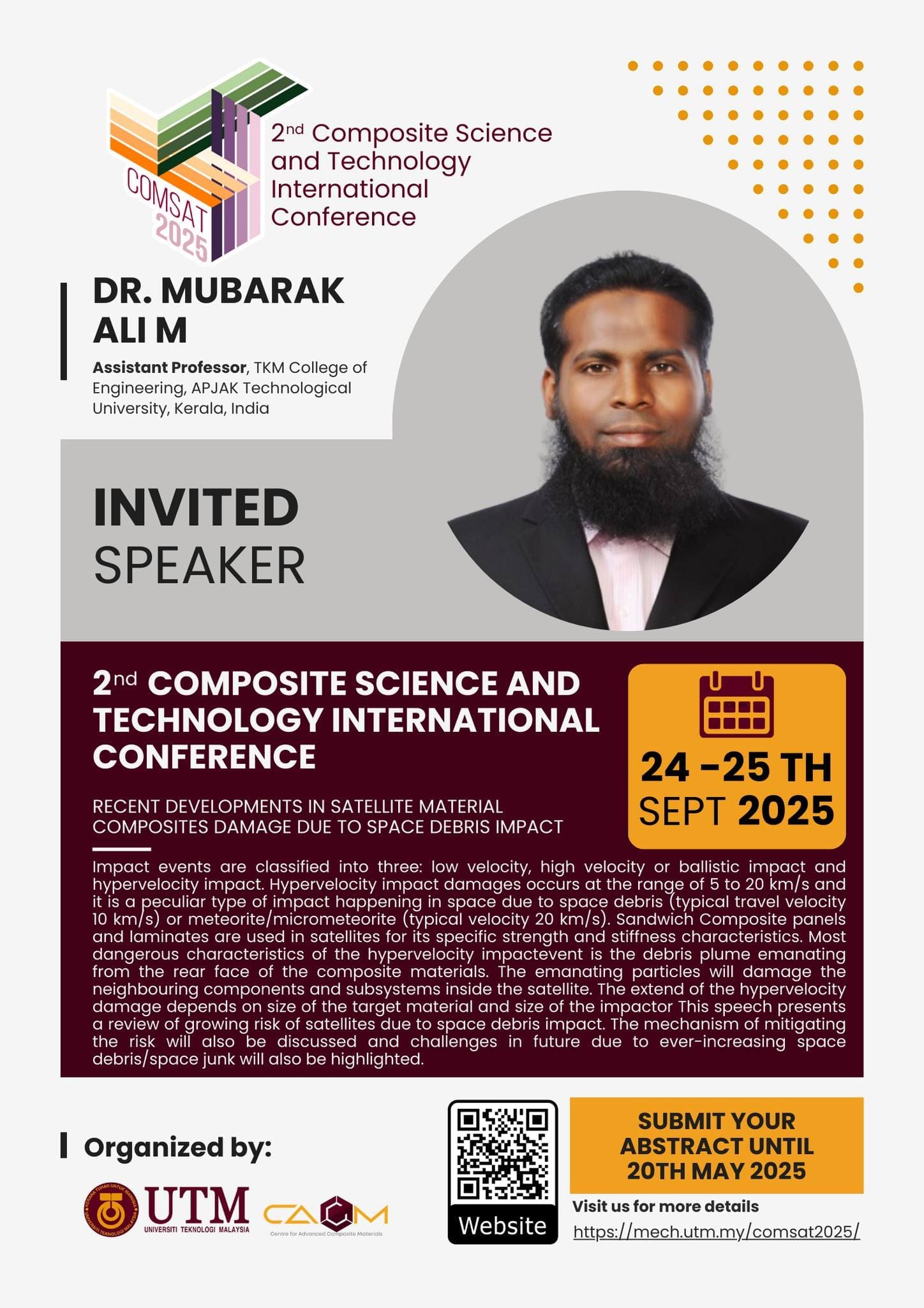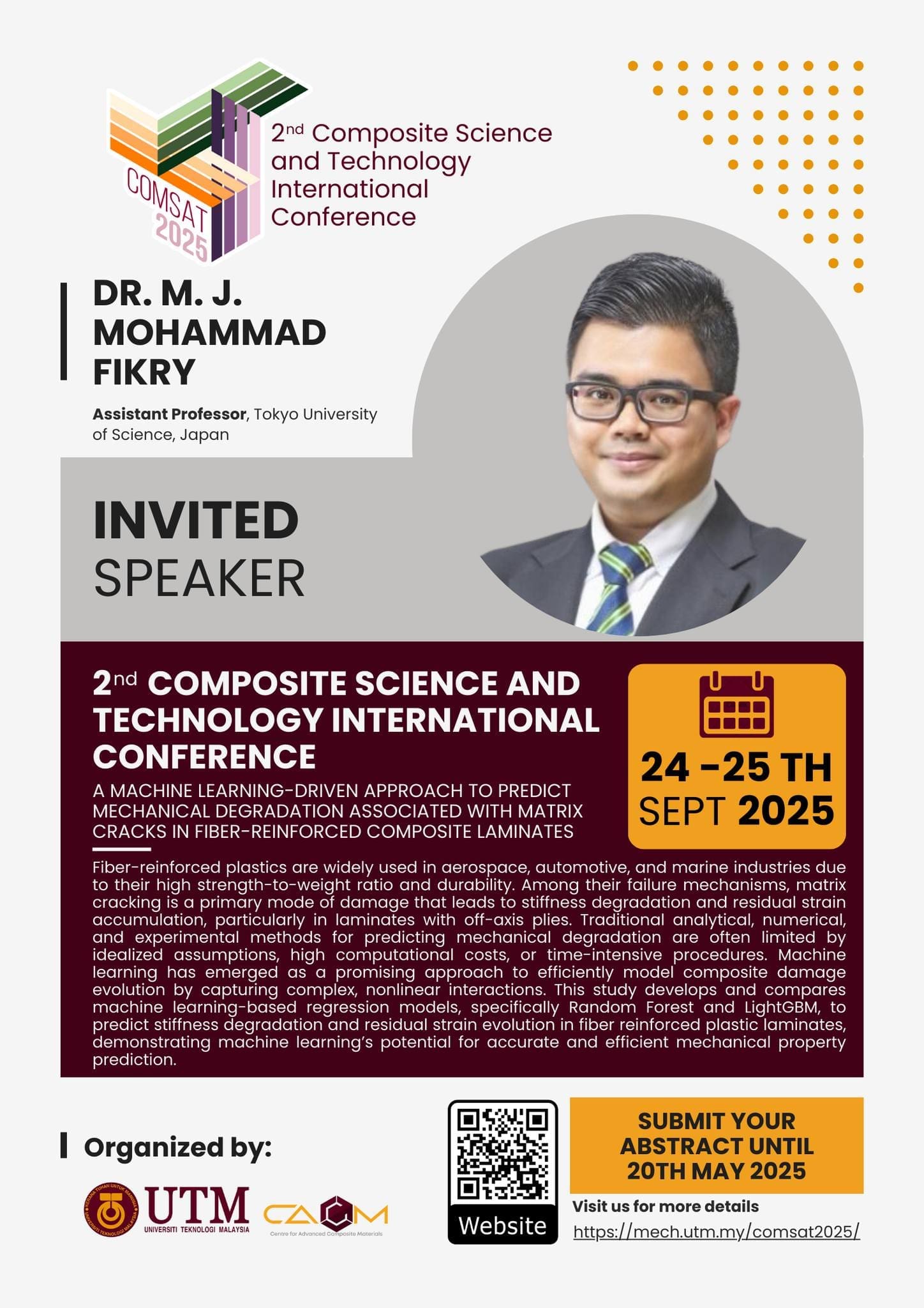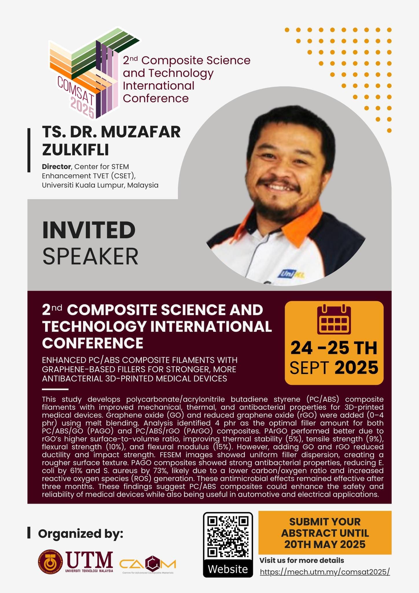 2nd Composite Sciences and Technology International Conference (COMSAT) 2025 is a prestigious tri-annual conference that gathers leading researchers, academics, and industry experts worldwide to exchange the latest advancements in composite materials. The conference covers various topics, including manufacturing, testing, characterization, and applications of composite materials. Following the success of the inaugural COMSAT2022, this edition will also be conducted entirely online, ensuring accessibility for participants across different regions. The main theme of COMSAT2025 is “Sustainable and Digitalized Advanced Composite Solutions to Global Challenges.” This theme underscores the pivotal role of composite materials in addressing contemporary global issues, particularly in sustainability and digital transformation. COMSAT 2025 is organized by the Centre for Advanced Composite Materials (CACM), Universiti Teknologi Malaysia (UTM), in collaboration with over 20 universities and research institutes from around the world.