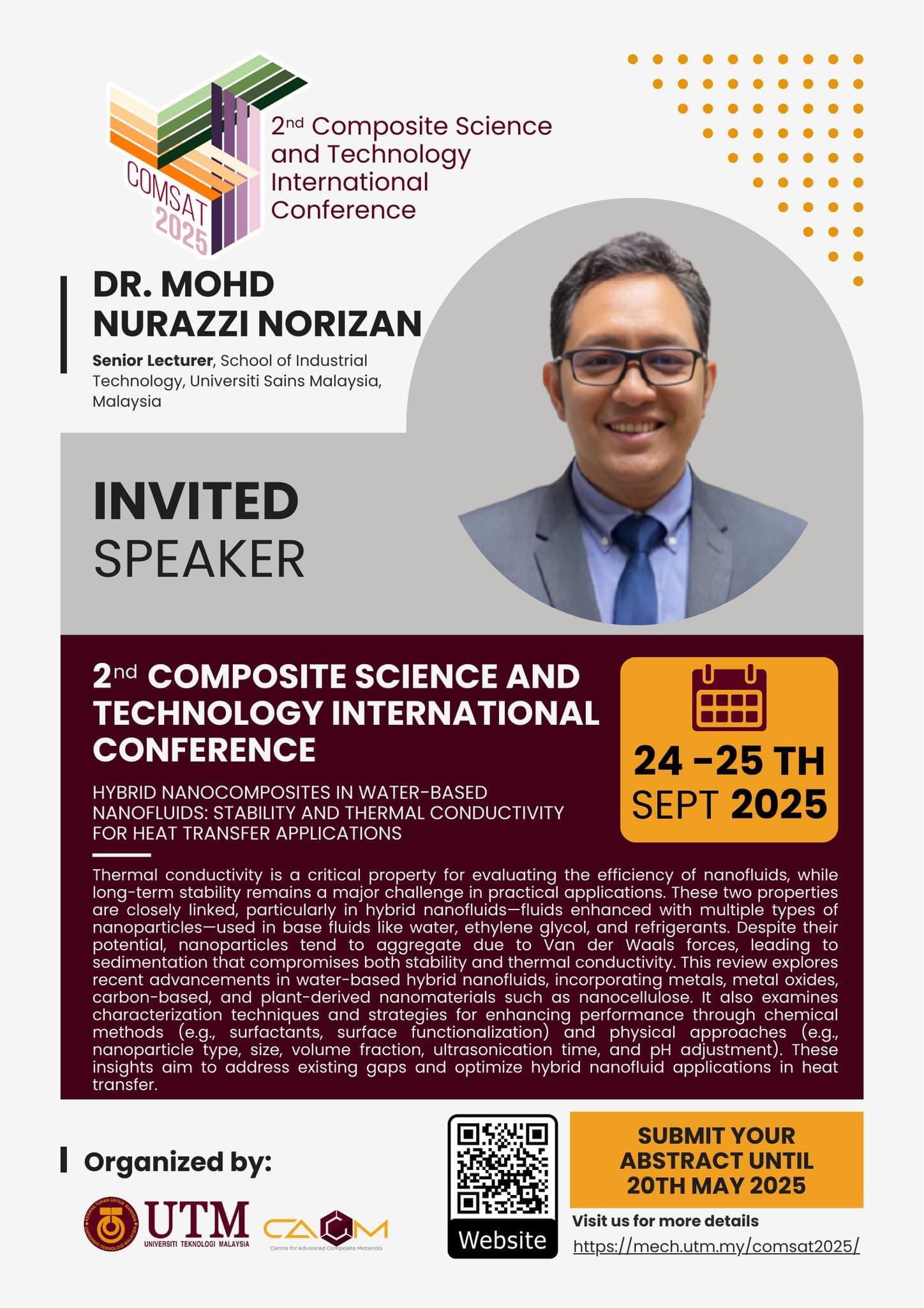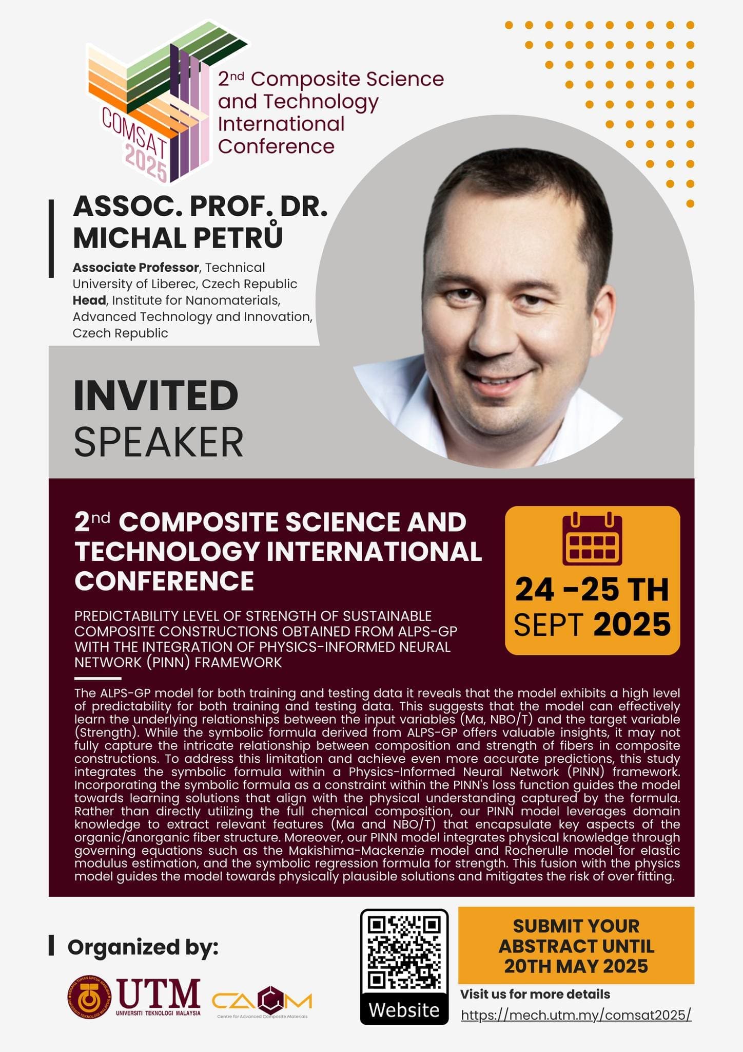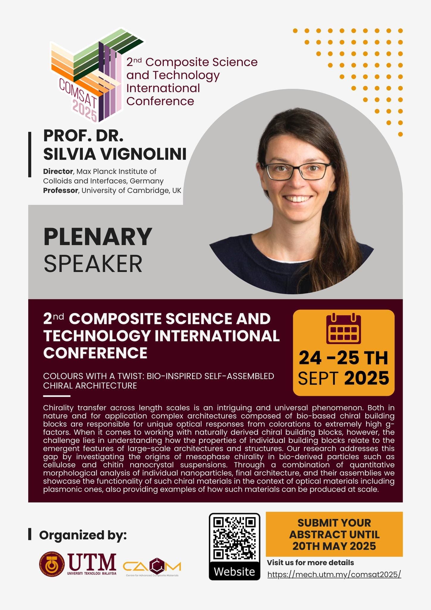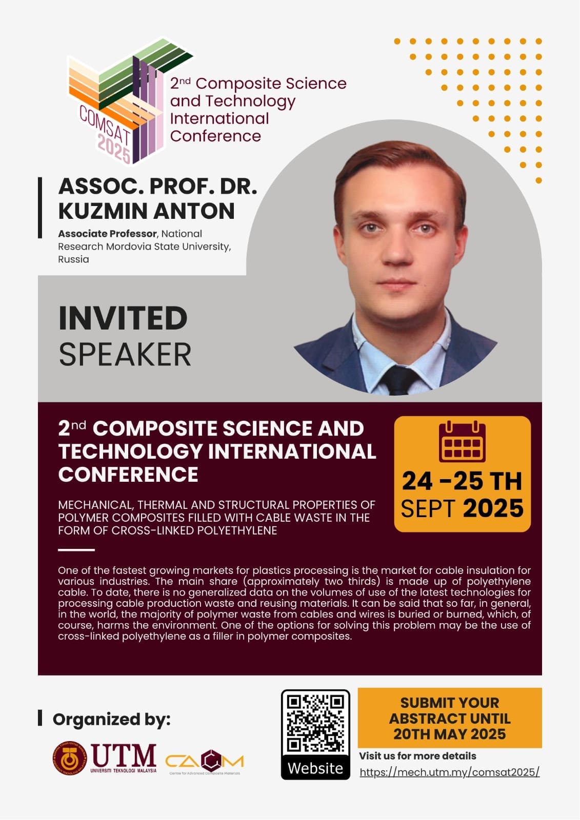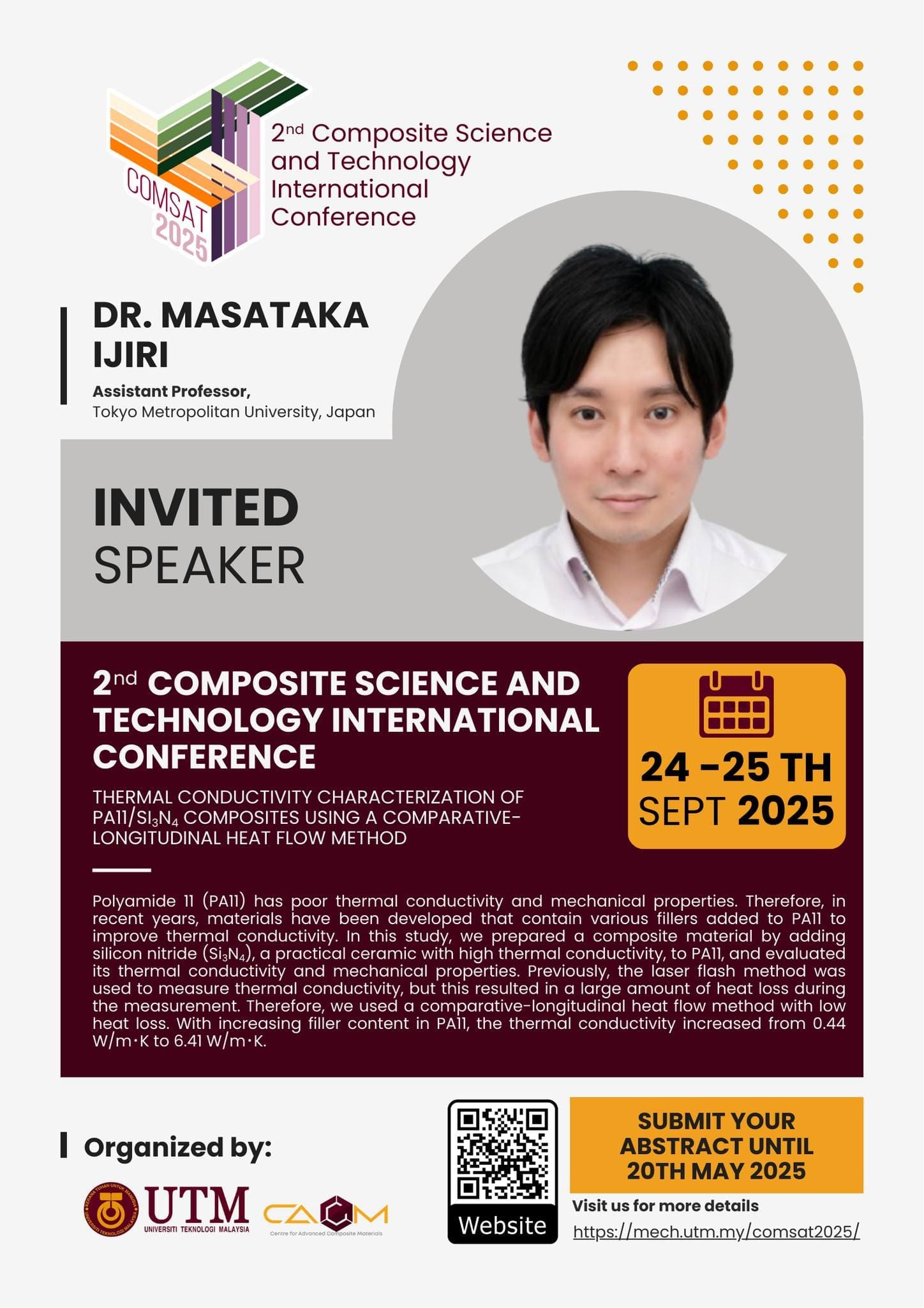2nd Composite Sciences and Technology International Conference (COMSAT) 2025 is a prestigious tri-annual conference that gathers leading researchers, academics, and industry experts worldwide to exchange the latest advancements in composite materials. The conference covers various topics, including manufacturing, testing, characterization, and applications of composite materials. Following the success of the inaugural COMSAT2022, this edition will also be conducted entirely online, ensuring accessibility for participants across different regions. The main theme of COMSAT2025 is “Sustainable and Digitalized Advanced Composite Solutions to Global Challenges.” This theme underscores the pivotal role of composite materials in addressing contemporary global issues, particularly in sustainability and digital transformation. COMSAT 2025 is organized by the Centre for Advanced Composite Materials (CACM), Universiti Teknologi Malaysia (UTM), in collaboration with over 20 universities and research institutes from around the world.