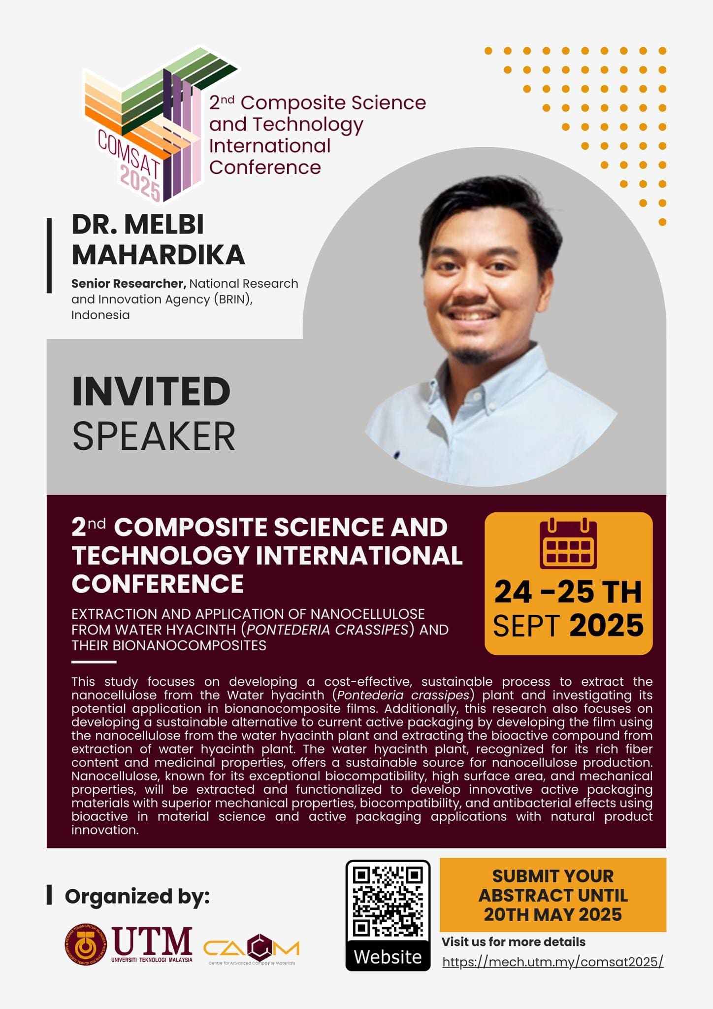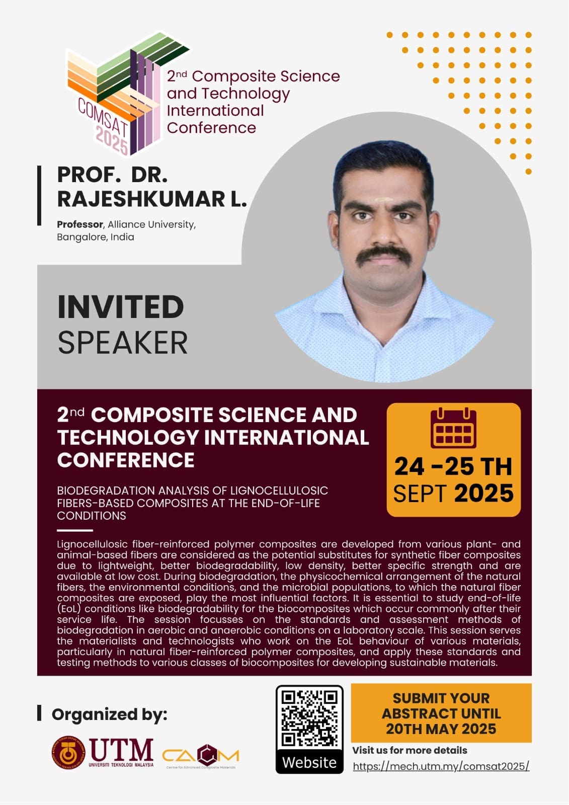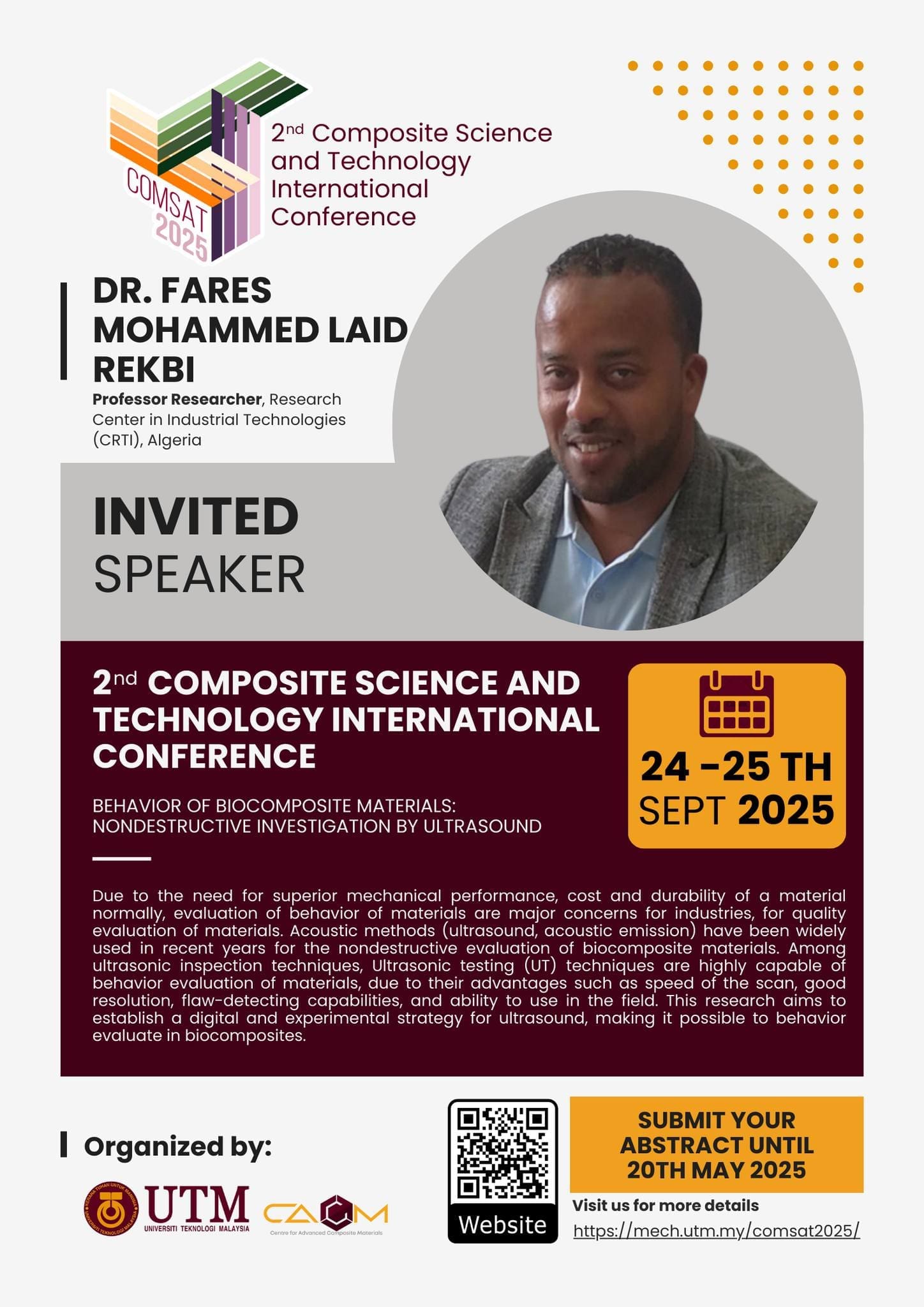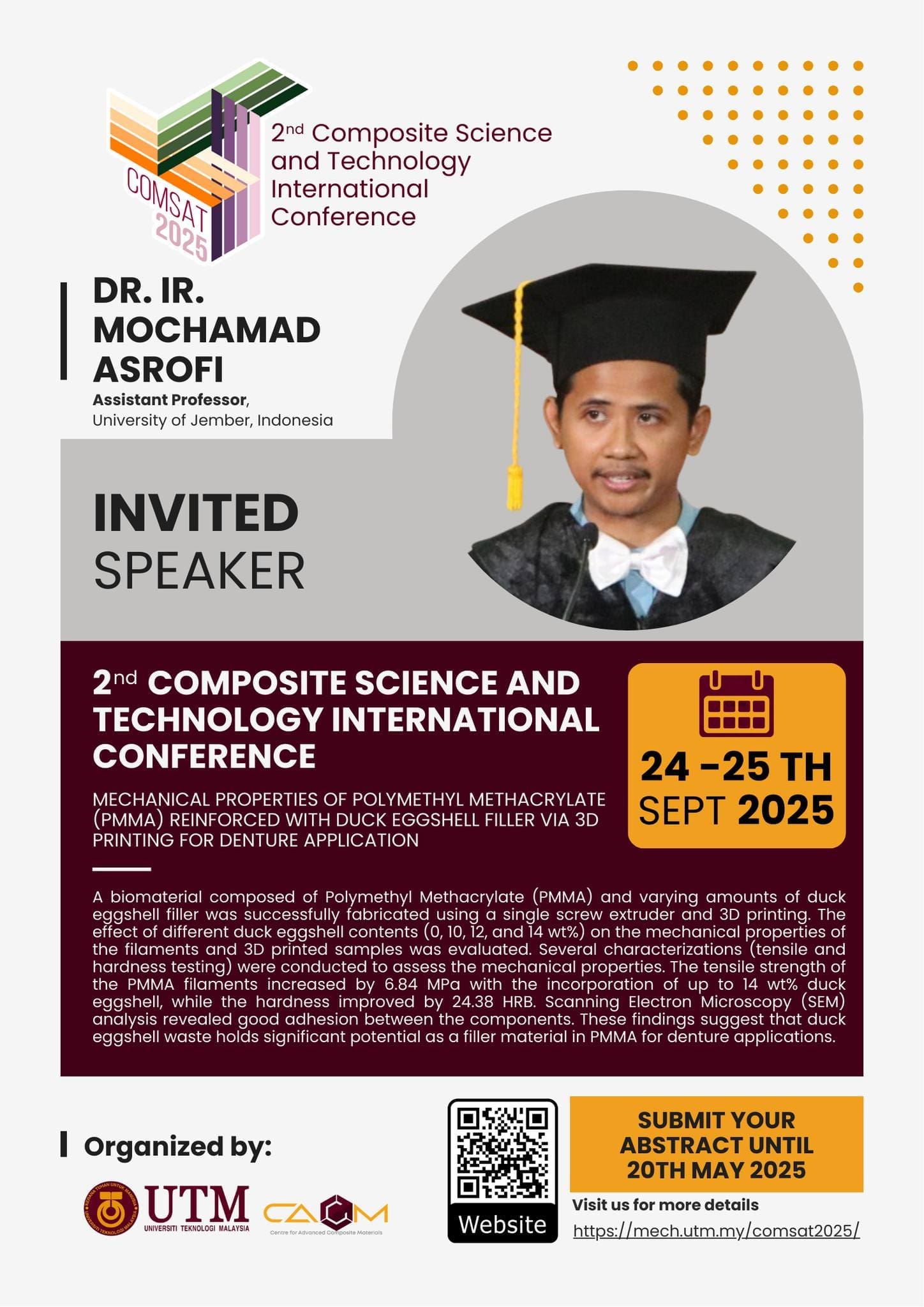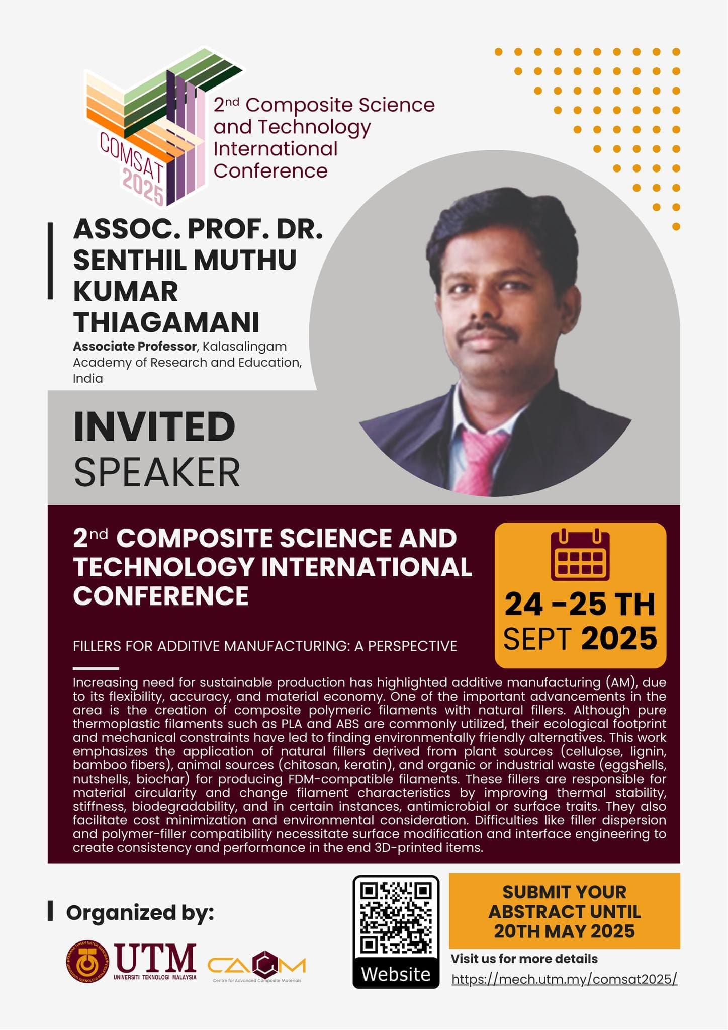 2nd Composite Sciences and Technology International Conference (COMSAT) 2025 is a prestigious tri-annual conference that gathers leading researchers, academics, and industry experts worldwide to exchange the latest advancements in composite materials. The conference covers various topics, including manufacturing, testing, characterization, and applications of composite materials. Following the success of the inaugural COMSAT2022, this edition will also be conducted entirely online, ensuring accessibility for participants across different regions. The main theme of COMSAT2025 is “Sustainable and Digitalized Advanced Composite Solutions to Global Challenges.” This theme underscores the pivotal role of composite materials in addressing contemporary global issues, particularly in sustainability and digital transformation. COMSAT 2025 is organized by the Centre for Advanced Composite Materials (CACM), Universiti Teknologi Malaysia (UTM), in collaboration with over 20 universities and research institutes from around the world.