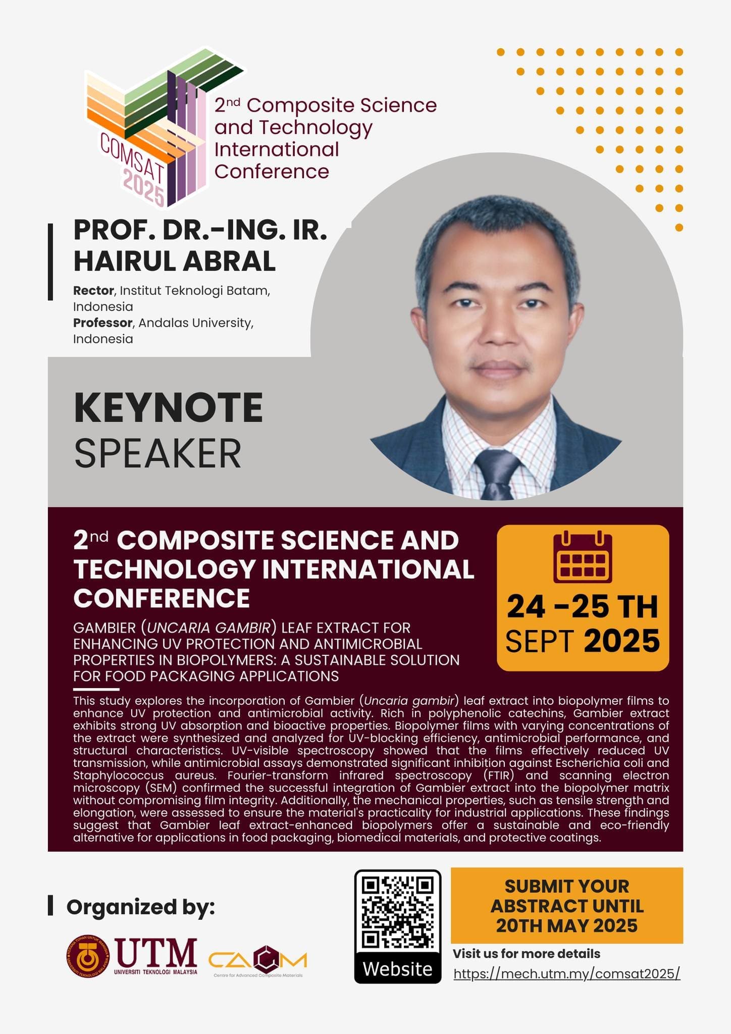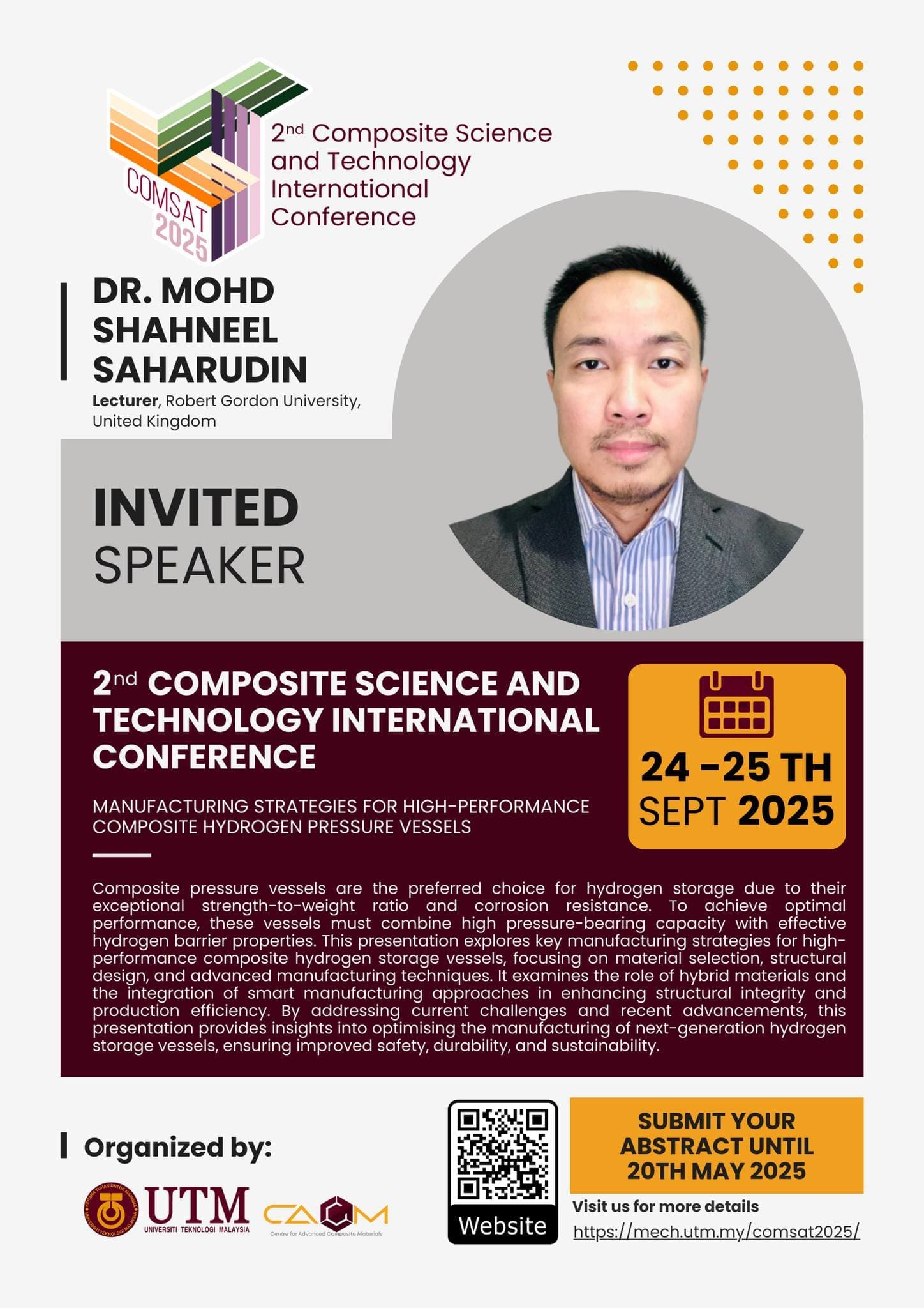 It is with great pleasure that we welcome you to the 2nd Composite Sciences and Technology International Conference (COMSAT 2025), hosted by the Centre for Advanced Composite Materials (CACM), Universiti Teknologi Malaysia. This conference marks a continued journey of collaboration and knowledge-sharing in the field of advanced composites. We are honoured to bring together a global community of researchers, scientists, engineers, and industry leaders who are passionate about shaping a sustainable and technologically advanced future.